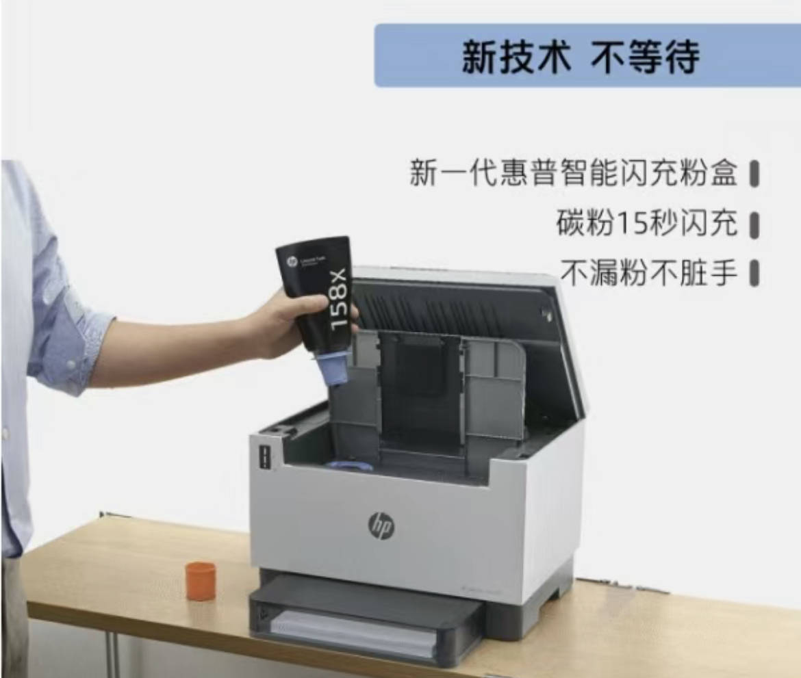 HP 2606dw 的大碳粉仓设计还支持 15 秒碳粉闪充。 当碳粉用完后,将惠普原装硒鼓插入惠普创系列2606dw的蓝色加墨口,仅需15秒。 秒完成灌粉过程,保证全程环保无害,不脏手。