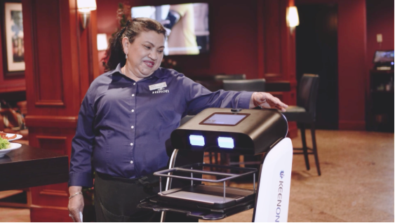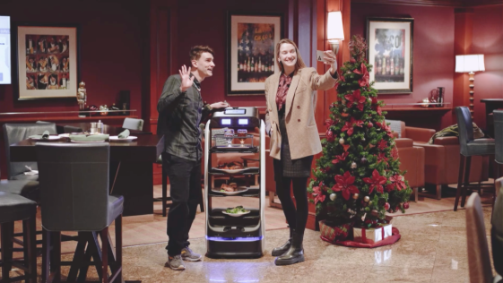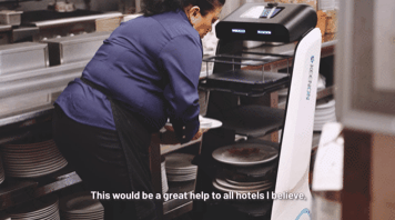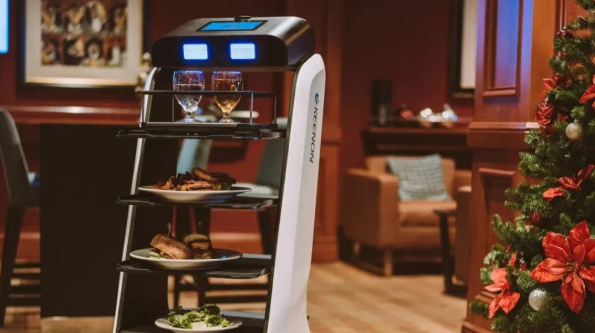 酒店工作人员只需在每层托盘上都装满菜品,然后按下屏幕上的开始按钮。机器人就开始了一天的配送工作。它满载着食物和饮料在酒店里来回奔跑,有时还要格外的注意避开人群和桌椅,总之,它一定会将食物和饮料平稳且安全的送至顾客面前。