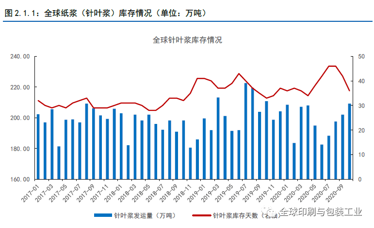 根据PPPC 的最新多个方面数据显示,10月全球纸浆发运量 453.万吨,较9月(488.7万吨)减少7.2%,较去年同期增长1.7%。库存39天,较上月(42天)下降3天,较去年同期(46天)下降7天。其中针叶浆发运量208万吨,库存36天;阔叶浆227万吨,库存42天。