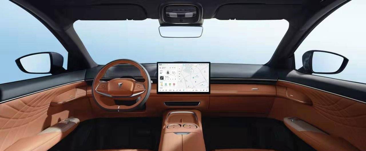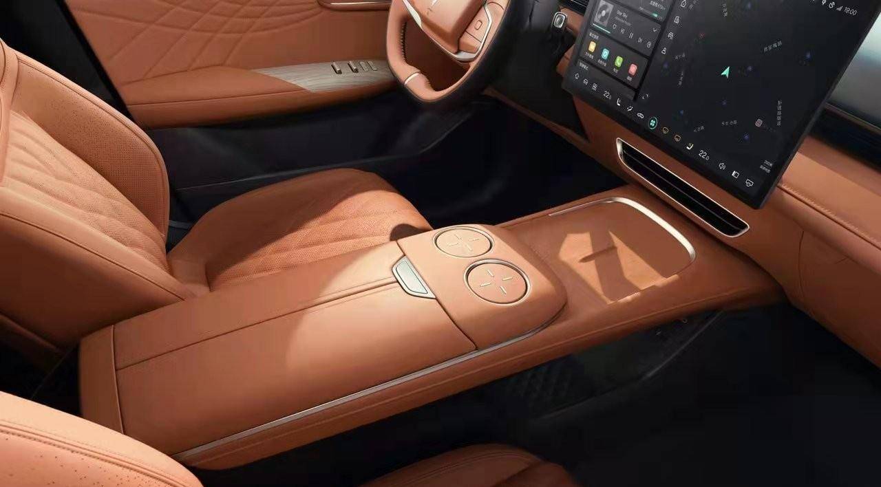 内饰方面,新车设计更加独特,取消了我们熟悉的仪表盘,配备了一块投影面积很大的HUD抬头显示,中间配备了大尺寸悬浮式中控大屏,下方为空调出风口,两幅式多功能方向盘造型时尚,2023扶手区域配备了手机无线充电区域和杯架,整个内饰上下采用双拼色设计,而且很简洁,基本上没有实体按键。